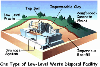 สถานที่จัดเก็บกากกัมมันตรังสีแบบถาวรสำหรับกากกัมมันตรังสีระดับต่ำและกลางเป็นสถานที่จำเพาะ ออกแบบให้มีความทนทานต่อการเป็นแปลงสภาวะภายนอกและป้องกันการรั่วไหลของกากกัมมันตรังสีรวมทั้งลดระดับความแรงรังสีได้เป็นอย่างดี ตั้งอยู่บนผิวดินหรือลึกลงไปในระดับ 3-4 เมตร มีฐานและผนังทั้ง 4 ด้านเป็นคอนกรีต ภายหลังจากที่บรรจุถังใส่กากกัมมันตรังสีจนเต็มพื้นที่แล้วจะทำการเทซีเมนต์ลงไปให้เต็มพื้นที่เพื่อเป็นการผนึกอีกชั้นหนึ่ง หลังจากนั้นจึงปิดผนึกผนังด้านบนและทำการถมดินให้เต็มพื้นที่ สุดท้ายแล้วจึงทำการป้องกันไม่ให้มีการใช้พื้นที่ในระยะเวลาที่กำหนด (100-300 ปี)