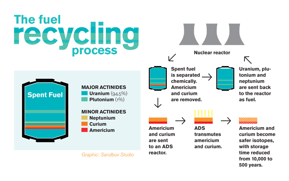 มีการเสนอให้พัฒนากระบวนการสกัดซ้ำและการหมุนเวียน เพื่อแยกพลูโตเนียมโดยใช้ธาตุ actinide แต่ยังเป็นวิธีการที่ยากในการทำให้อยู่ในรูปเชื้อเพลิงนิวเคลียร์ผสม และหมุนเวียนกลับมาใช้กับเครื่องปฏิกรณ์แบบธรรมดา โดยต้องนำไปใช้กับเครื่องปฏิกรณ์แบบนิวตรอนเร็ว ซึ่งยังมีจำนวนน้อย แต่มีข้อดีตรงที่ทำให้จัดการกับกากรังสีระดับสูงได้ง่ายขึ้น